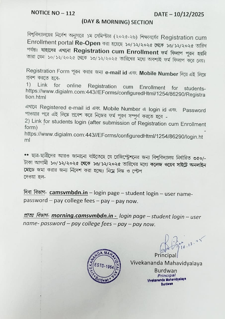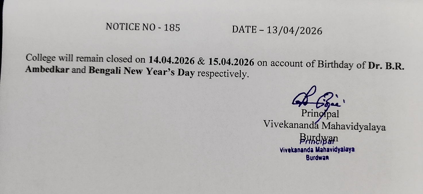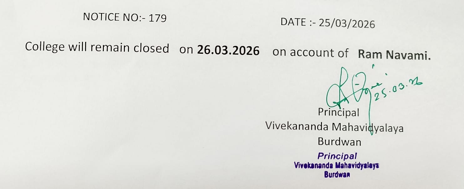 On the eve of Swami Vivekananda's Birthday Centenary in 1963, the District Magistrate of Burdwan Mr. K.P.S. Menon, Chairman of Zila Parishad, Mr. Narayan Chowdhury and other honourable citizens of Burdwan took initiatives to establish a new college in Burdwan town. Burdwan Municipality gifted a large chunk of land in the name of the proposed college in Sarshe Danga Mouza, Near Sadarghat. Mr. Prafulla Chandra Sen, the then Chief Minister of West Bengal, laid the foundation stone for the proposed Vivekananda Mahavidyalaya at the spot on 8th March, 1964, on 23rd Mr. K.P.S. Menon, as President Dr. Sailendranath Mukhopadhyaya, the renewed Physician, as the Vice President, and Chief Engineer of Burdwan Zila Parisad. Mr. Prafulla Kumar Pal, was appointed the secretary to the committe