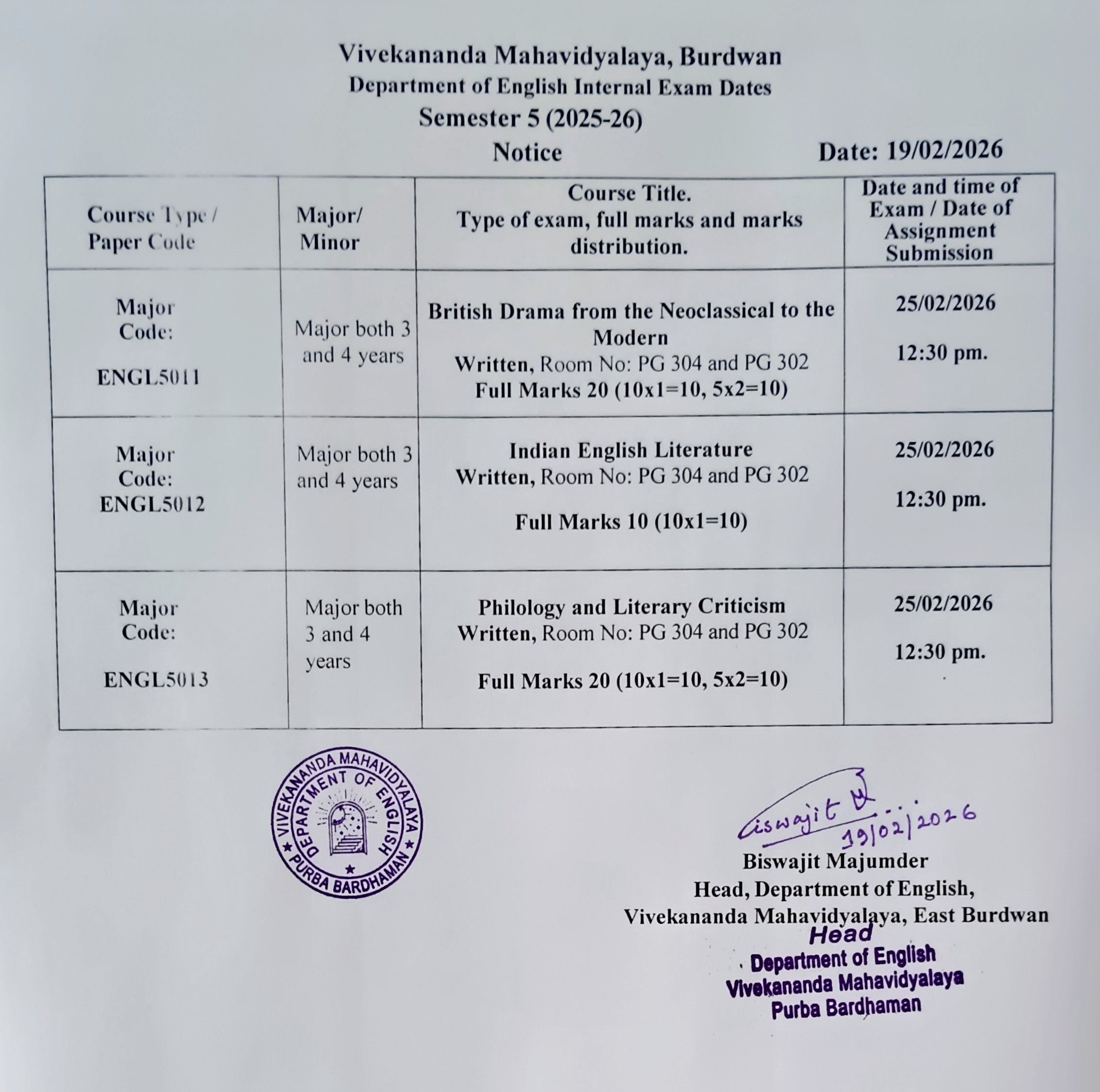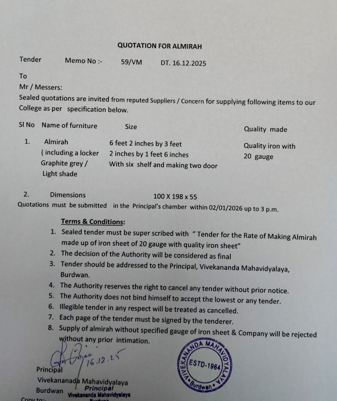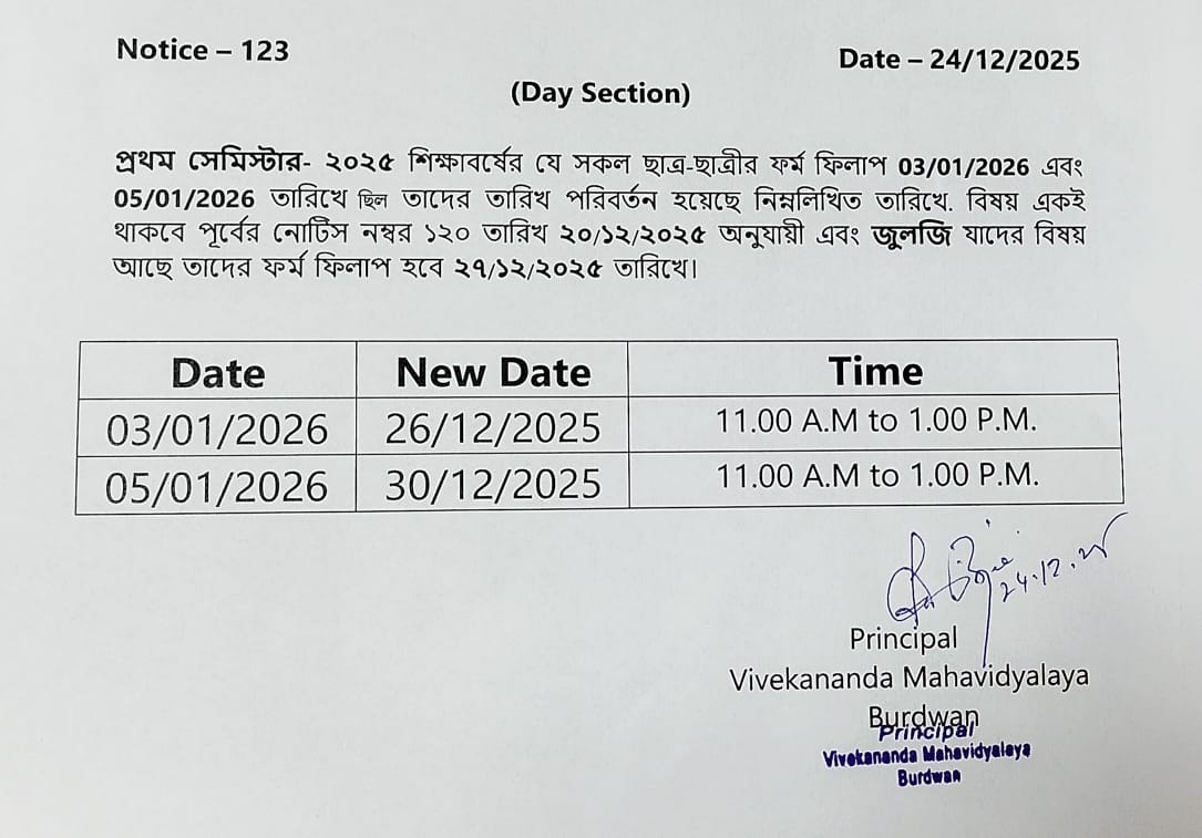 On the eve of Swami Vivekananda's Birthday Centenary in 1963, the District Magistrate of Burdwan Mr. K.P.S. Menon, Chairman of Zila Parishad, Mr. Narayan Chowdhury and other honourable citizens of Burdwan took initiatives to establish a new college in Burdwan town. Burdwan Municipality gifted a large chunk of land in the name of the proposed college in Sarshe Danga Mouza, Near Sadarghat. Mr. Prafulla Chandra Sen, the then Chief Minister of West Bengal, laid the foundation stone for the proposed Vivekananda Mahavidyalaya at the spot on 8th March, 1964, on 23rd Mr. K.P.S. Menon, as President Dr. Sailendranath Mukhopadhyaya, the renewed Physician, as the Vice President, and Chief Engineer of Burdwan Zila Parisad. Mr. Prafulla Kumar Pal, was appointed the secretary to the committe