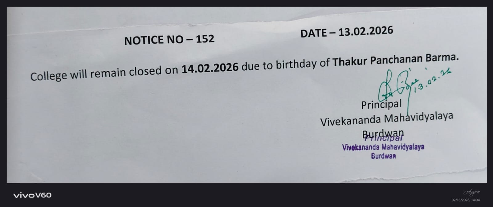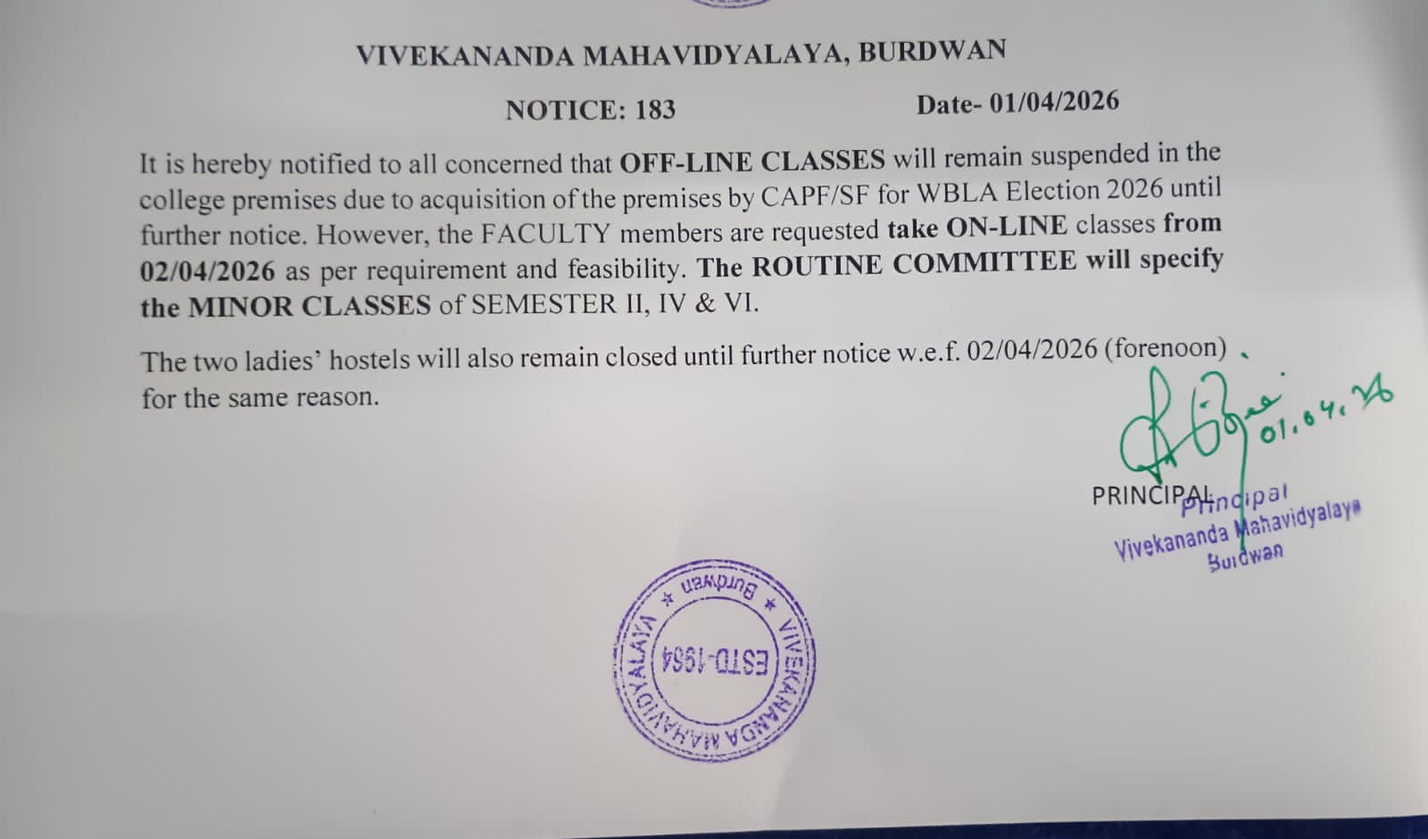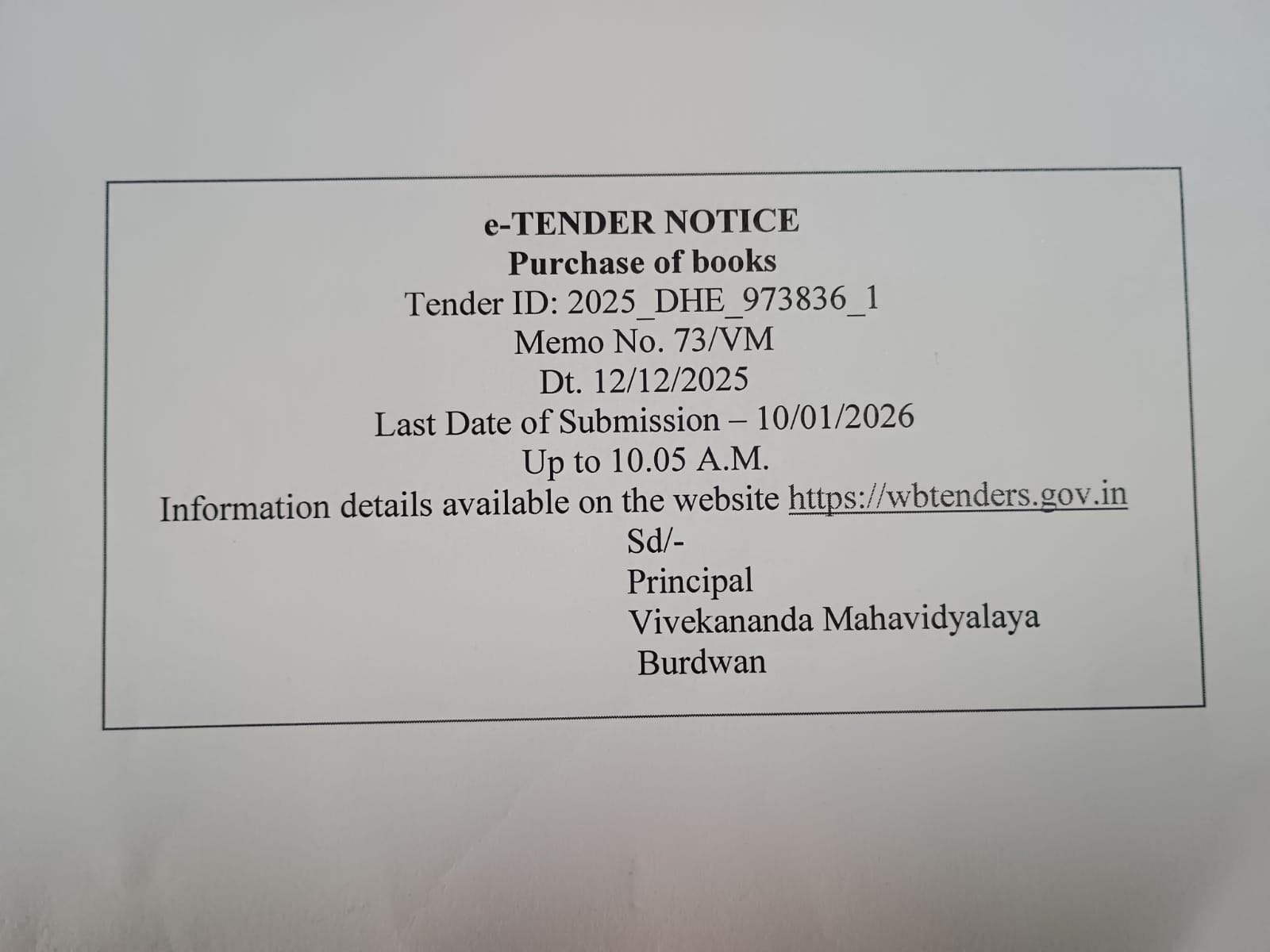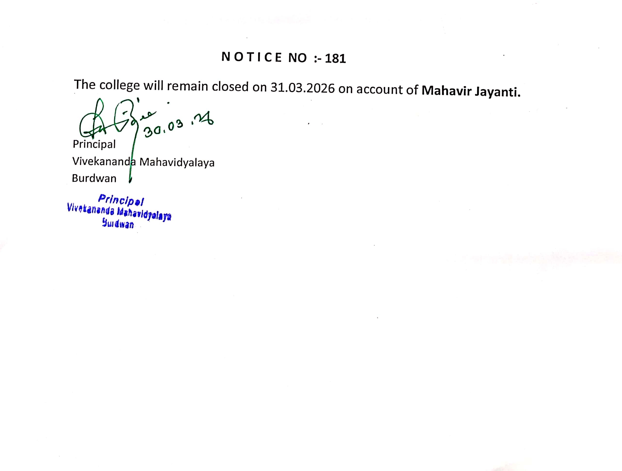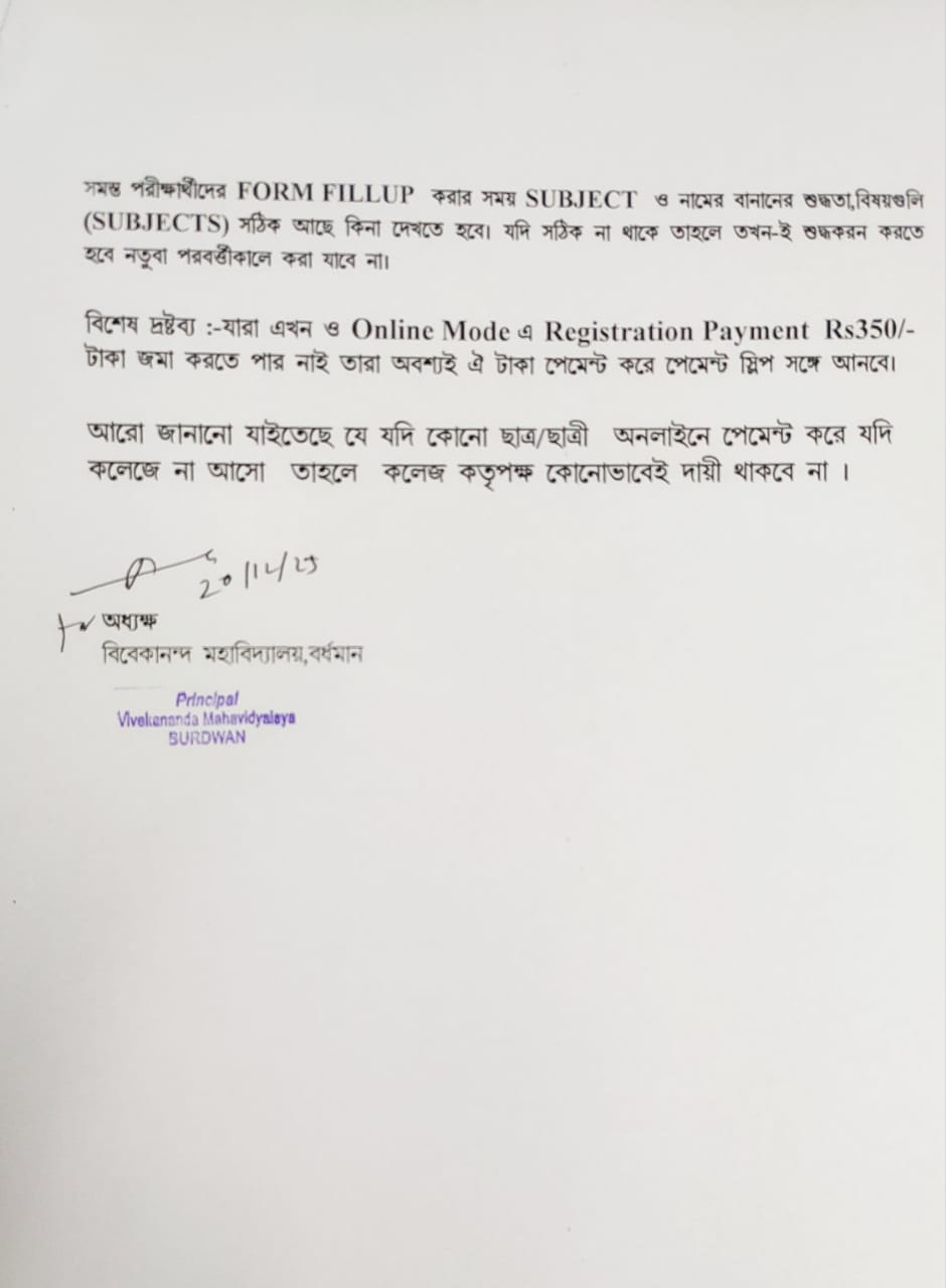 On the eve of Swami Vivekananda's Birthday Centenary in 1963, the District Magistrate of Burdwan Mr. K.P.S. Menon, Chairman of Zila Parishad, Mr. Narayan Chowdhury and other honourable citizens of Burdwan took initiatives to establish a new college in Burdwan town. Burdwan Municipality gifted a large chunk of land in the name of the proposed college in Sarshe Danga Mouza, Near Sadarghat. Mr. Prafulla Chandra Sen, the then Chief Minister of West Bengal, laid the foundation stone for the proposed Vivekananda Mahavidyalaya at the spot on 8th March, 1964, on 23rd Mr. K.P.S. Menon, as President Dr. Sailendranath Mukhopadhyaya, the renewed Physician, as the Vice President, and Chief Engineer of Burdwan Zila Parisad. Mr. Prafulla Kumar Pal, was appointed the secretary to the committe