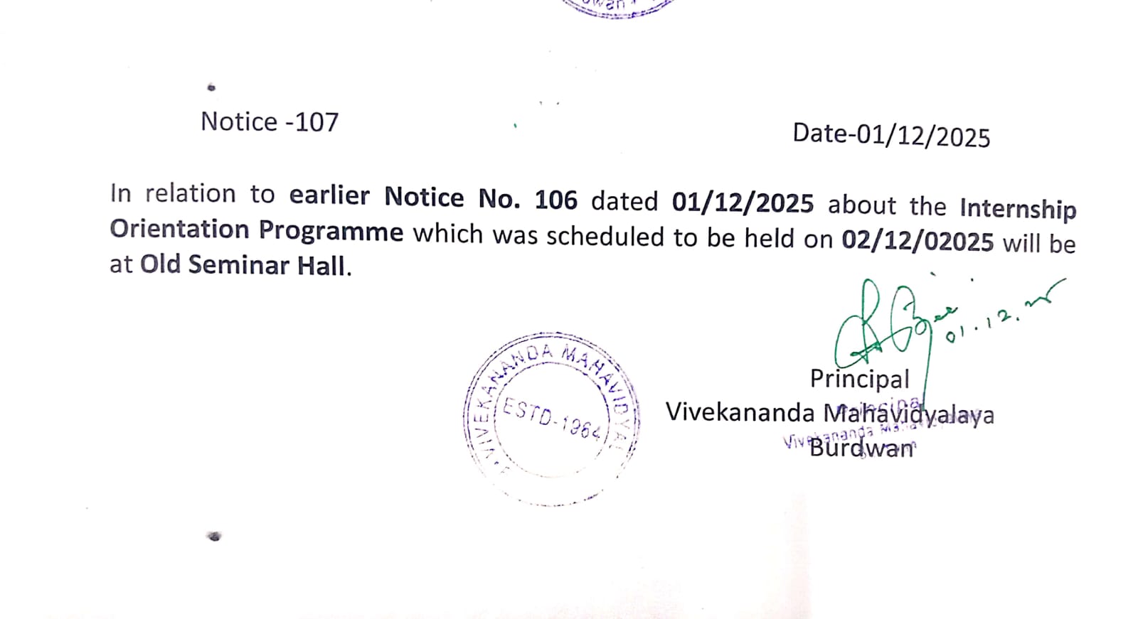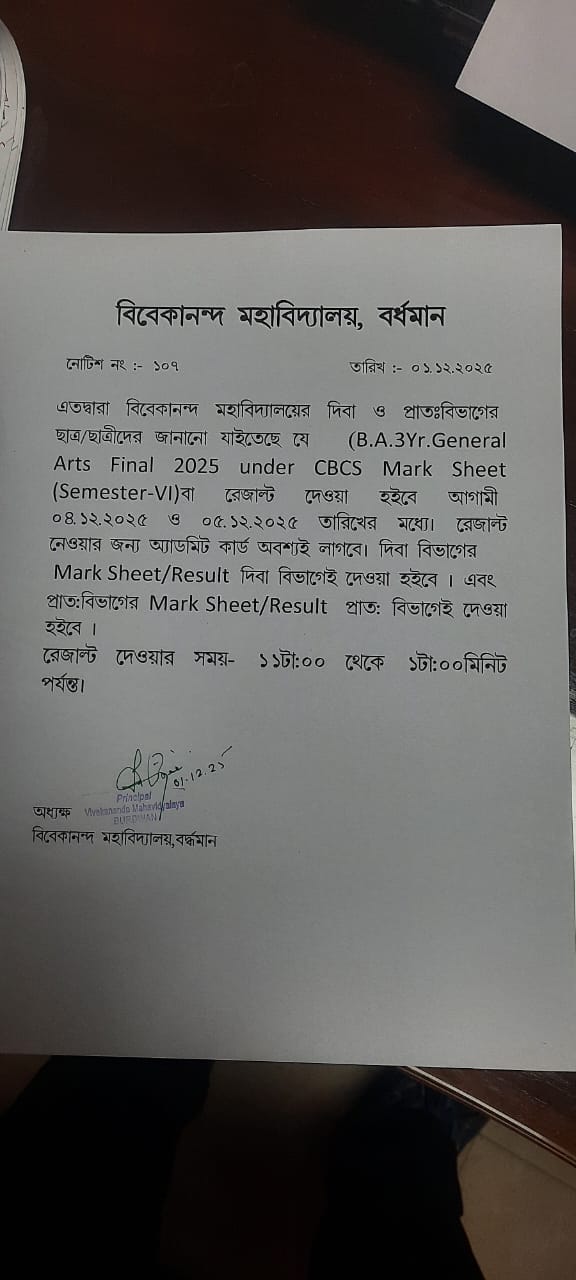 On the eve of Swami Vivekananda's Birthday Centenary in 1963, the District Magistrate of Burdwan Mr. K.P.S. Menon, Chairman of Zila Parishad, Mr. Narayan Chowdhury and other honourable citizens of Burdwan took initiatives to establish a new college in Burdwan town. Burdwan Municipality gifted a large chunk of land in the name of the proposed college in Sarshe Danga Mouza, Near Sadarghat. Mr. Prafulla Chandra Sen, the then Chief Minister of West Bengal, laid the foundation stone for the proposed Vivekananda Mahavidyalaya at the spot on 8th March, 1964, on 23rd Mr. K.P.S. Menon, as President Dr. Sailendranath Mukhopadhyaya, the renewed Physician, as the Vice President, and Chief Engineer of Burdwan Zila Parisad. Mr. Prafulla Kumar Pal, was appointed the secretary to the committe